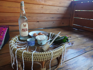 ノンタオ村出発の朝には、各ホストファミリーにお別れをして、ジョニさんの家に集合。そこではサプライズの招魂の儀式が準備されていました。カレン語で「キチュ・コクラ(縄で魂を呼ぶ)」。(と聞こえましたが違ってたらごめんなさい)通常はカレンのお正月にあたる2月と8月後半に行われる儀式だそうです。お酒とお米とお供えものの花があり、ジョニさんが儀式の言葉を唱えたあと、1人ひとり、健康と旅の安全を祈って、魂がどこかにさまよってしまわないよう、白い縄を腕に結んでいただきました。