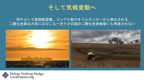 現在の経済システムでは、大企業が化石燃料を使い、まさに地球をまたにかけてグローバルに取引しています。しかし、その実態は「狂気の貿易」にほかなりません。アメリカでは何十万トンという牛肉を輸入しながら、同時に同じ量の牛肉を輸出しています。例えば、魚をどこか別の国に送り、骨を取ってもらったものを送り戻す、リンゴを他の国に送り、そこで加工されたものを送り戻す。たとえば、イギリスから南アフリカに送られて、そこで洗われたものをまたイギリスに戻すということが起きているわけです。しかし、この飛行機や船などの商品輸送にかかわるCO2が計算されていません。